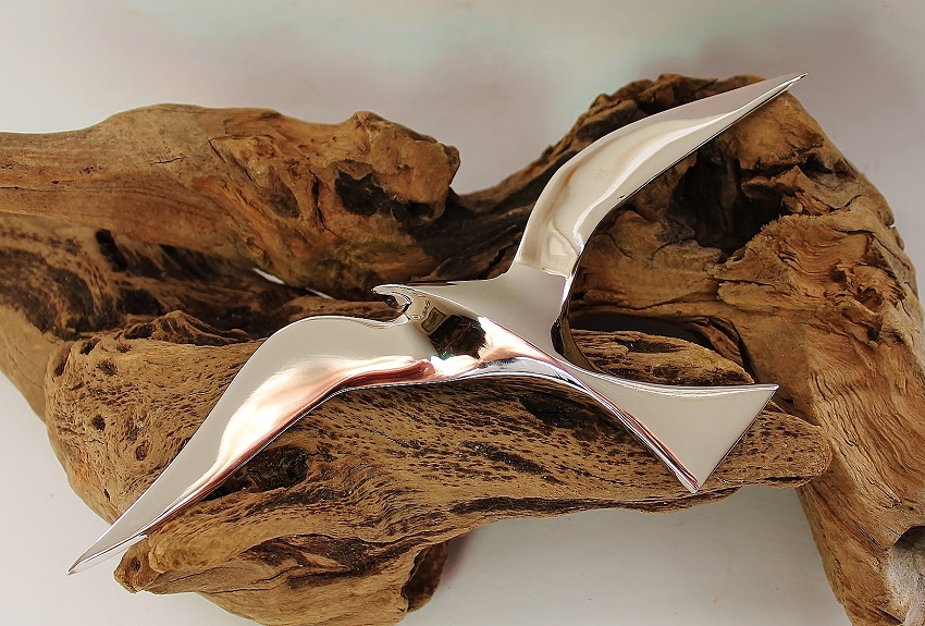 Dekorative Möwe aus Messing vernickelt, auf der Rückseite ist ein Ring zum Aufhängen. Durch Verwendung mehrerer Möwen in verschiedenen Größen lässt sich eine individuelle maritime Wanddeko als Möwenschwarm erstellen.