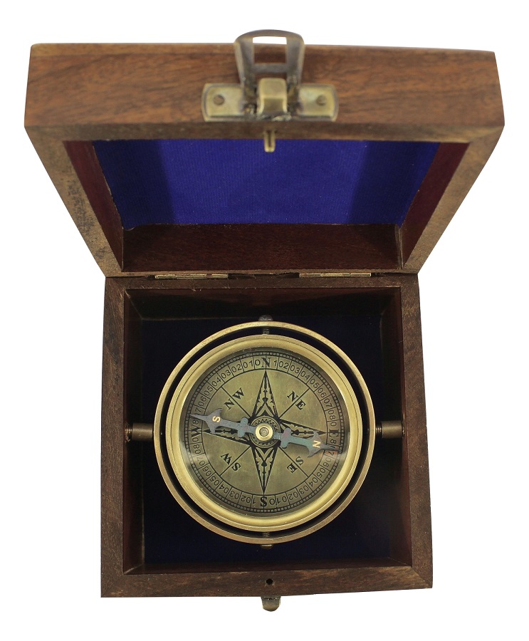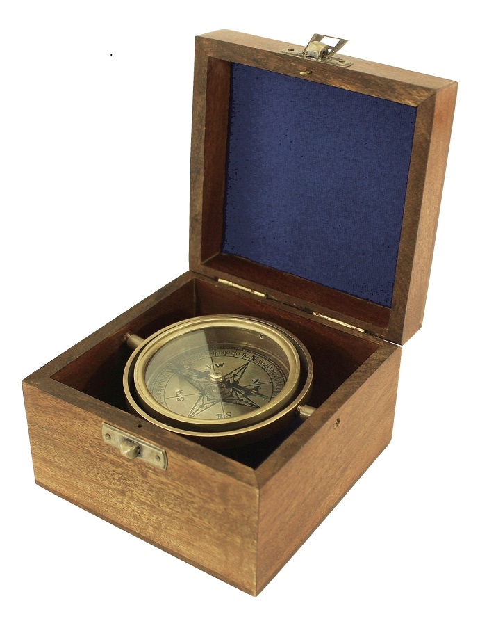 Dekorativer Kompass Messing antik kardanisch aufgehängt in einer dekorativen Holzbox
