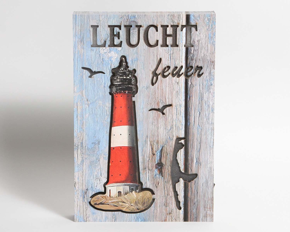 Originelles maritimes Bild aus Holz im Vintage-Style als gealtertes Aussehen mit Leuchtturm Pilsum als Motiv. An der Seite befindest sich ein Wippschalter zum An-und Ausstrellen des Lichtes. Der Betrieb erfolgt mit 3 Batterien AA (nicht im Lieferumfang)