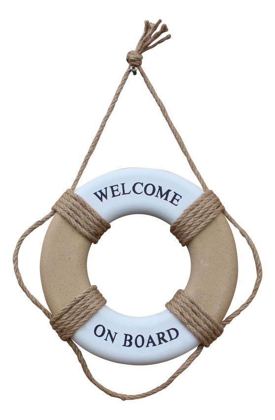 Dekorativer Rettungsring "WELCOME OM BOARD" hergestellt aus Holz mit Tau, Außen- Ø: 30 cm, Höhe 4 cm in 3 verschiedene Farbkombinationen