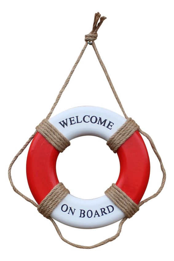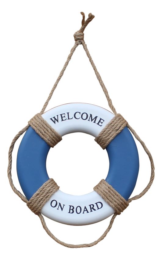 Dekorativer Rettungsring "WELCOME OM BOARD" hergestellt aus Holz mit Tau, Außen- Ø: 35 cm, Höhe 5,5 cm in 3 verschiedene Farbkombinationen