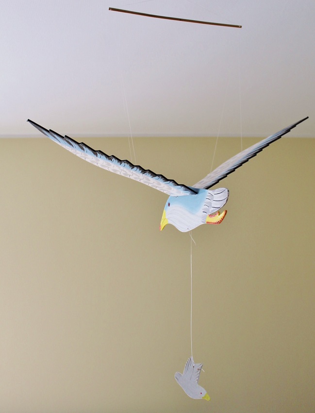 Schwebene Möwe fürs Kinderzimmer aus Holz zum Anhängen , Spannweite der Möwe ca. 77 cm Länge 34 cm, Gesamthöhe ca. 95 cm, am unteren Ende befindet sich noch ein kleine Möwe zum Ziehen
