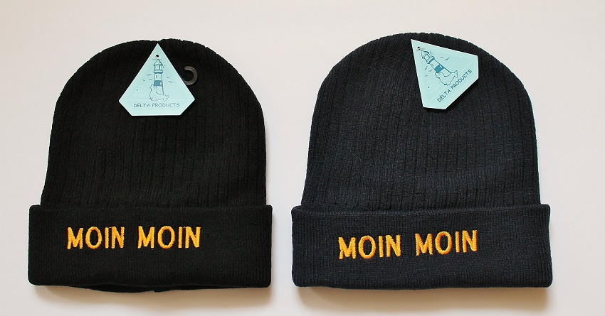Witzige maritime Mütze für kalte Tage mit Stickerei MOIN MOIN in einem dunklen Blau oder Schwarz, aus 100% Polyacryl, Handwäsche